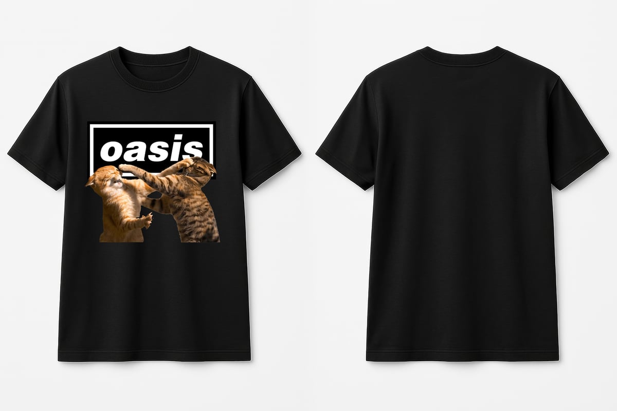A camiseta “Oasis Cats Fight” é a mistura perfeita de humor, estilo e nostalgia. Inspirada na lendária banda Oasis, ela traz dois gatos brigando — uma referência divertida aos famosos irmãos Gallagher.