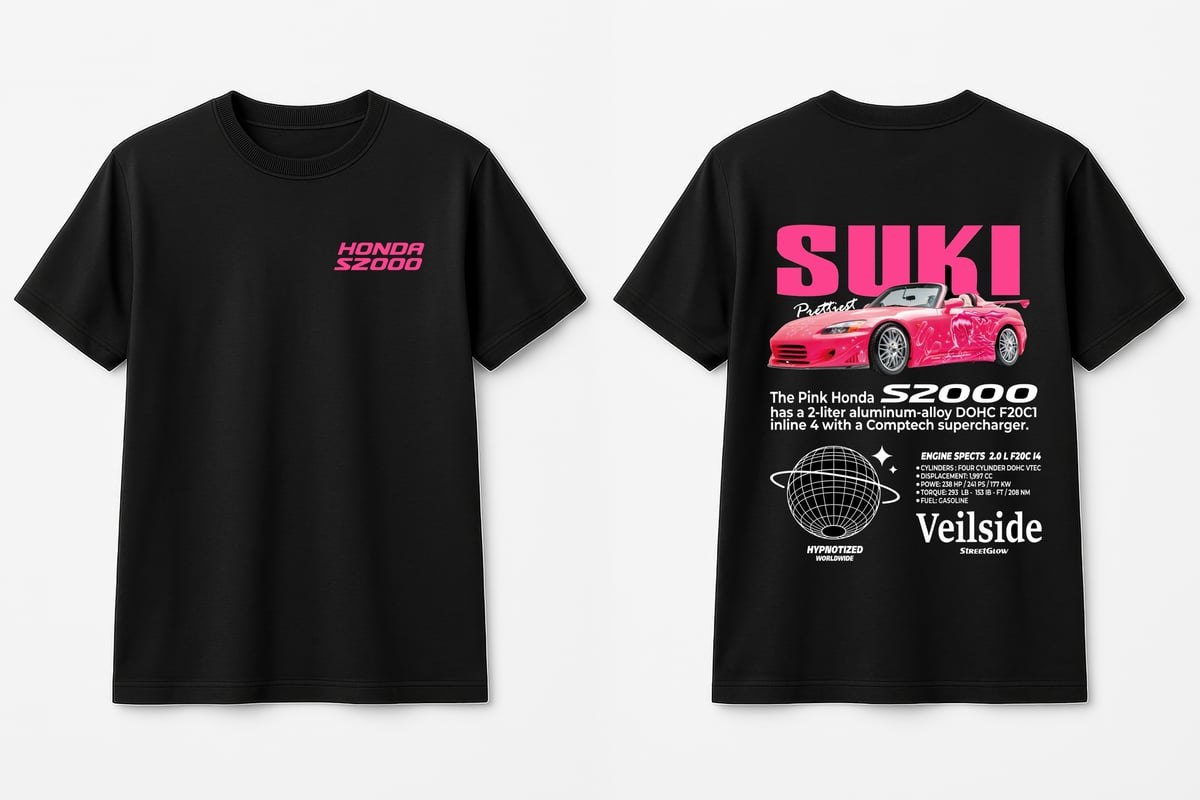 Sinta a adrenalina das ruas de Miami com a camisa Honda S2000 da Suki, inspirada no lendário carro rosa do filme +Velozes +Furiosos (2 Fast 2 Furious).