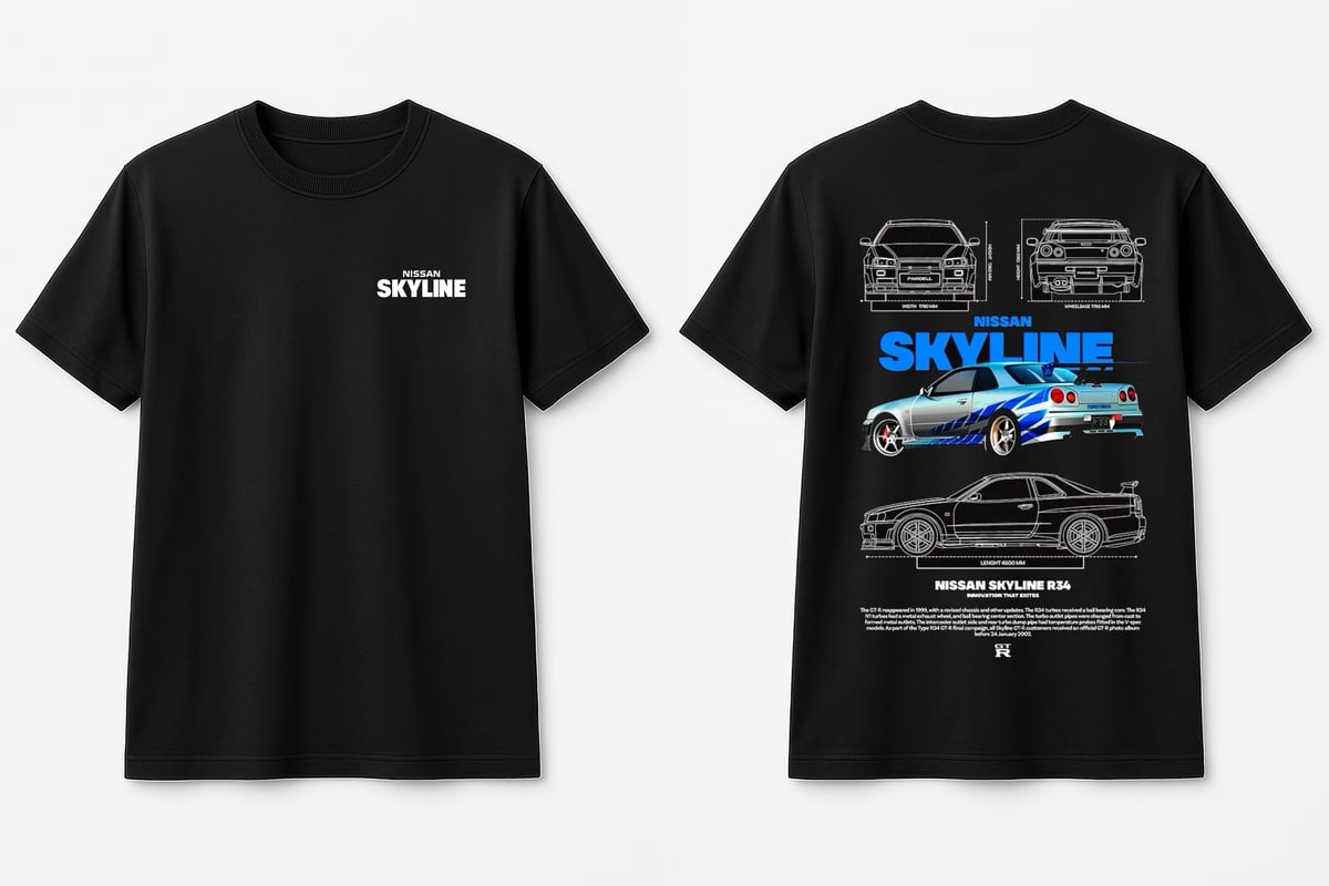 Estampa em alta definição na frente e nas costas, com o icônico Skyline GT-R R34, símbolo de potência e cultura automobilística.